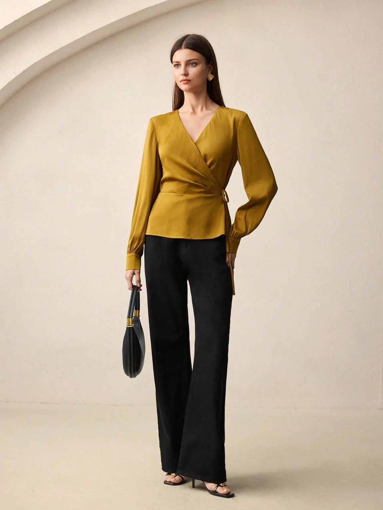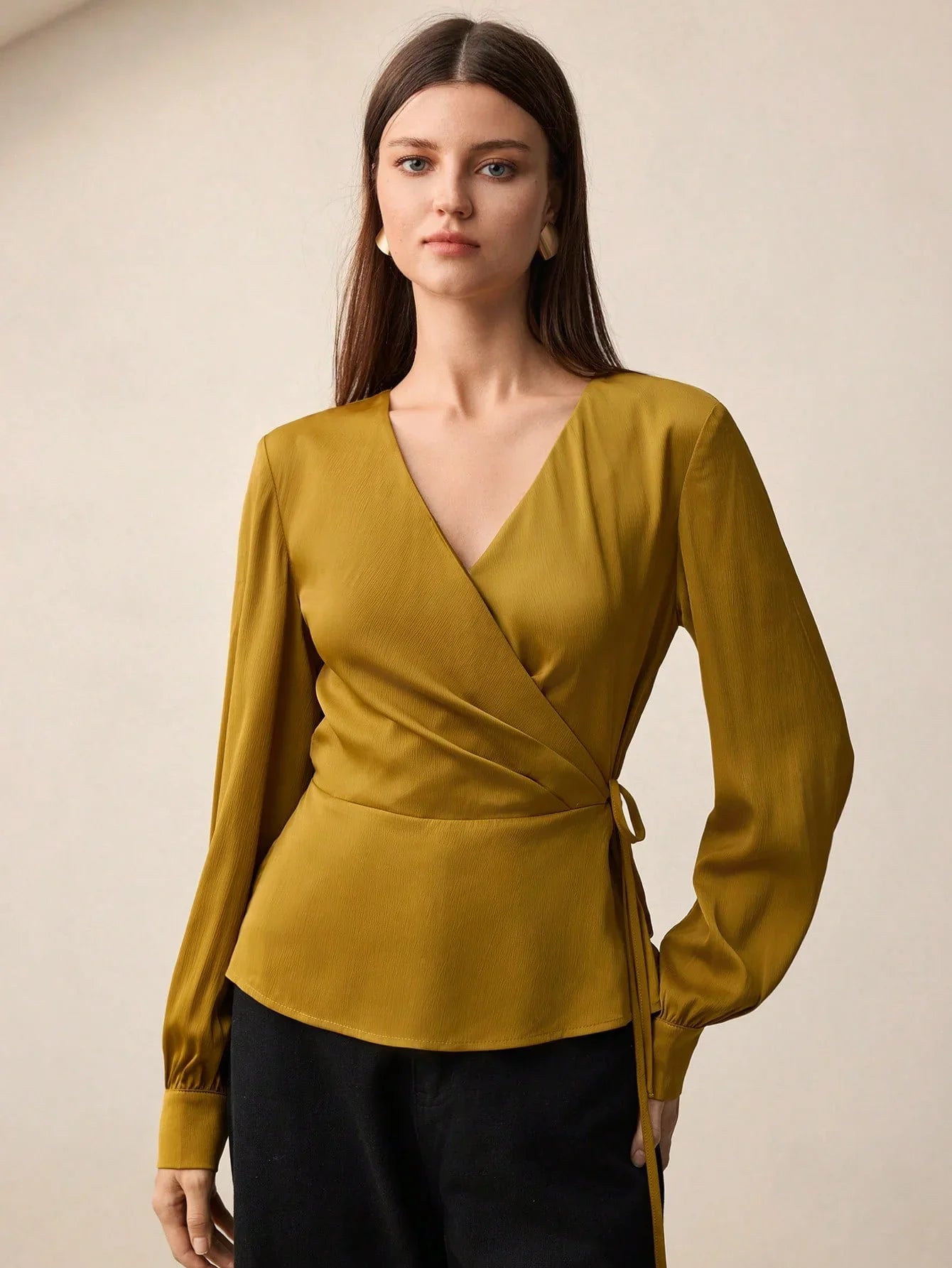 La blusa de satén rezuma elegancia atemporal y lujo tranquiloUn elegante lazo en la cintura forma un delicado peplum que realza la figura, mientras que el escote en V le aporta un toque refinado y femenino. Las mangas largas mantienen una silueta limpia y minimalista, ideal para... estilo de dinero antiguo y moda minimalista.