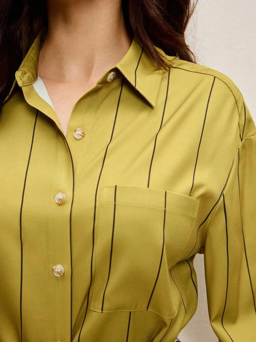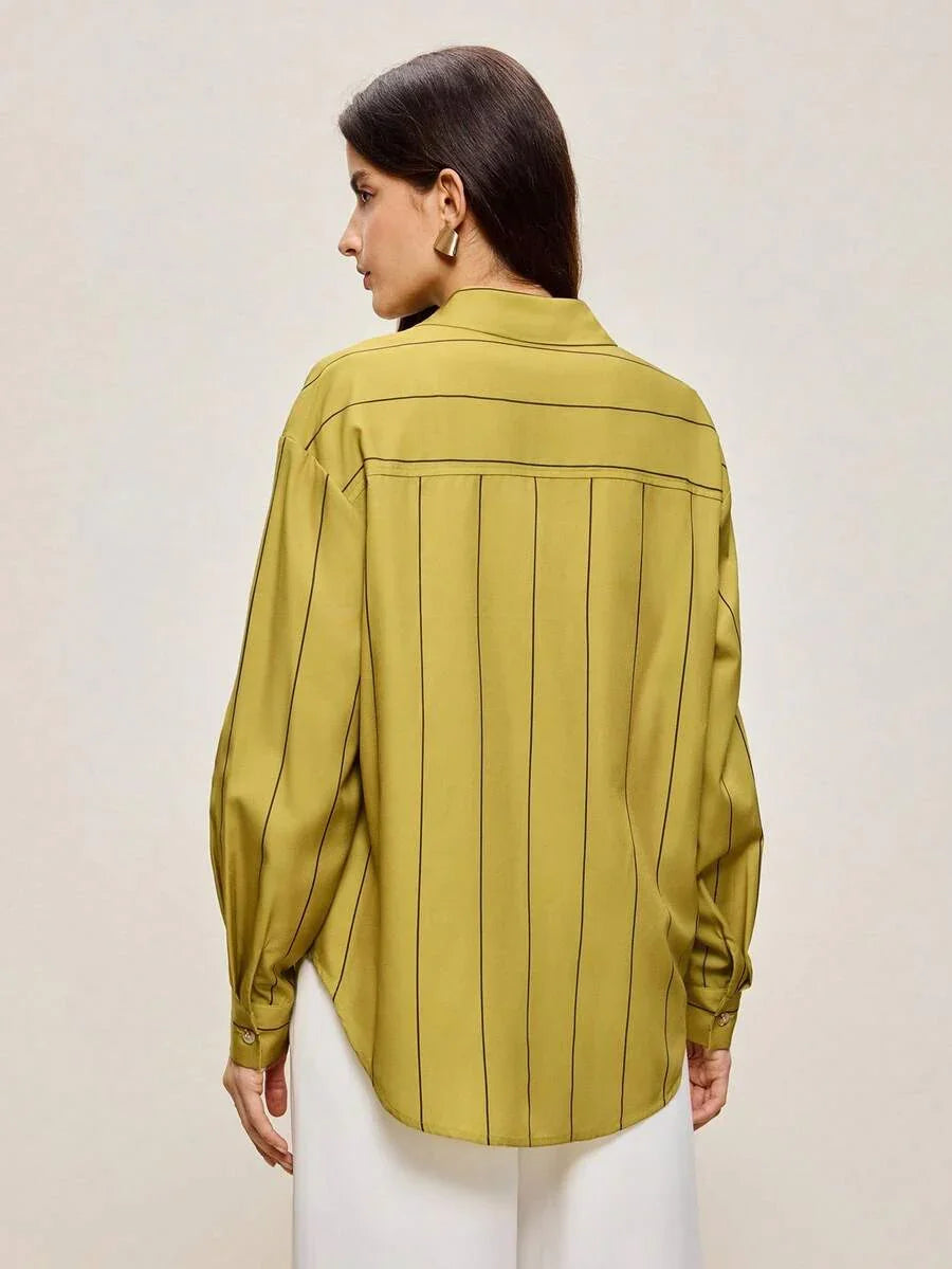 Una camisa con solapa y botones en un verde refinado encarna la elegancia atemporal y el lujo discreto. Los detalles de los bolsillos le aportan un toque sutil y práctico, mientras que el cuello camisero clásico, las mangas largas y el bajo asimétrico crean una silueta minimalista y elegante, ideal para la oficina o para el día a día.