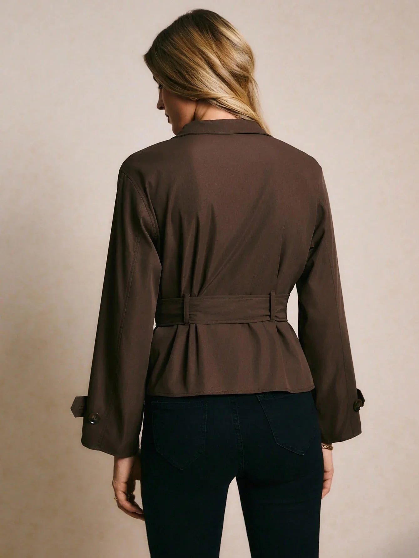La elegancia atemporal se fusiona con el lujo discreto en esta gabardina con cinturón. La tapeta cruzada y el cuello alto crean una silueta elegante y refinada. Las mangas raglán aportan comodidad con un toque contemporáneo. Un cinturón define la cintura para un look a medida. El estampado liso y el color marrón café le dan un acabado minimalista y versátil. El cuerpo no tiene forro, lo que le da un estilo limpio y estilizado. No incluye bolsillos, lo que le da un perfil elegante y depurado.