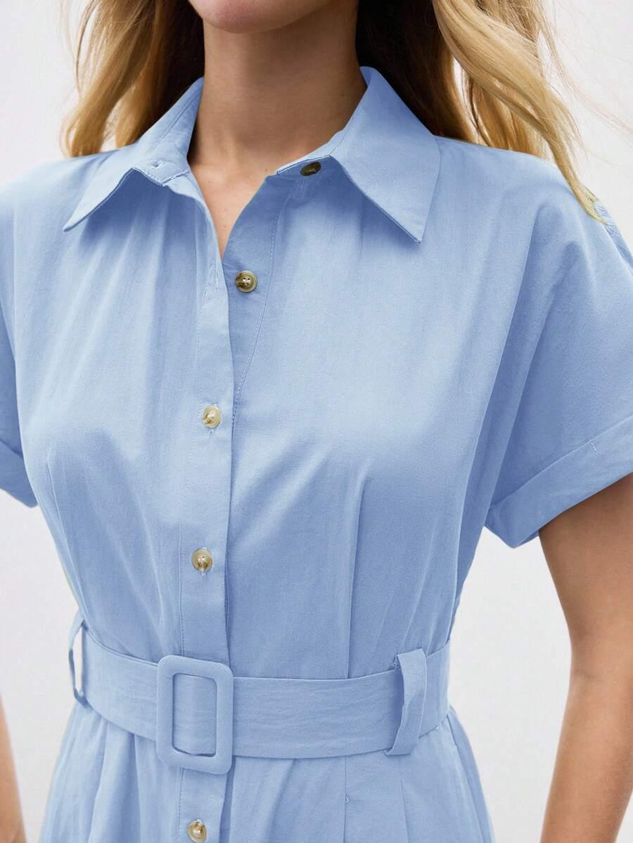 Elegancia atemporal y lujo tranquilo Define este vestido camisero informal con cuello y bolsillos. El cuello estructurado y las líneas limpias crean una silueta elegante y minimalista, mientras que los prácticos bolsillos le dan un toque práctico para el día a día. Un cinturón ciñe la cintura alta para una silueta definida y femenina. Las mangas murciélago ofrecen una caída suave y el bajo acampanado se adapta a tus movimientos para un look versátil y elegante durante todo el día. Transpirable, suave y agradable al tacto, esta prenda es perfecta para las amantes de la moda minimalista que buscan un estilo atemporal en sus looks diarios.